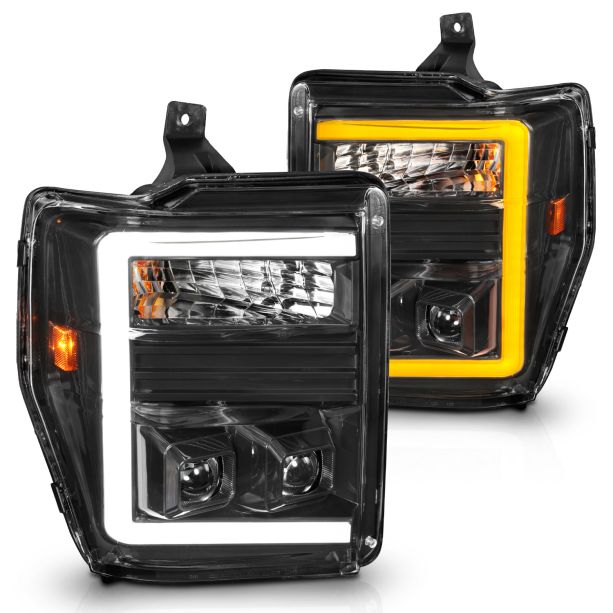 Upgrade your 08-10 Ford Super Duty with this Projector Switchback Plank Style Headlight Set. It features a sleek black housing, a clear lens, and a modern design that enhances both visibility and style.