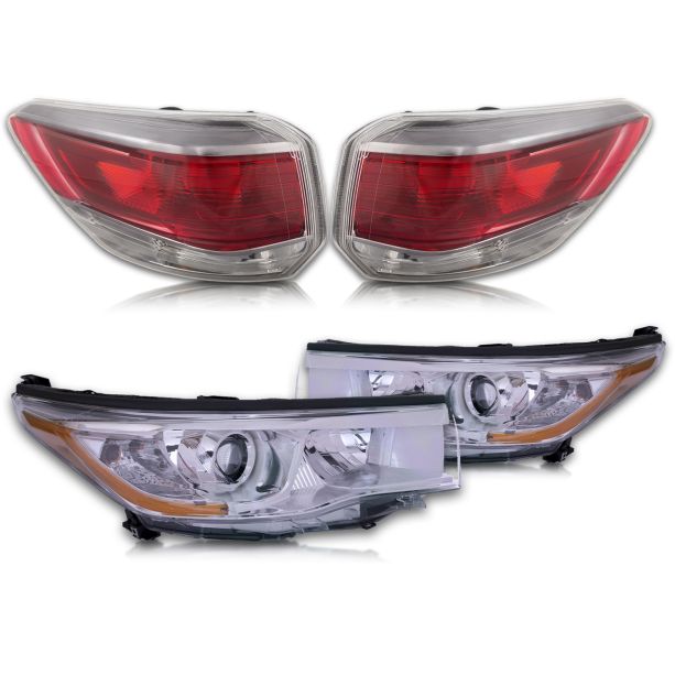 Upgrade the look and performance of your 2014-2016 Toyota Highlander with this Headlight and Tail Light Set from Headlights Depot. This set includes both the driver and passenger side headlights and tail lights, providing a complete upgrade for your vehicle. The headlights feature a sleek chrome housing and use halogen bulbs for improved visibility and driving safety. The tail lights are designed without smoked chrome accents, providing a clean and modern look for your Highlander. These aftermarket lights are compatible with and can replace the original lights on your 2014-2016 Toyota Highlander. Upgrade your vehicle today and experience the benefits of these high-quality headlights and tail lights. Please note that bulbs are not included with this set.